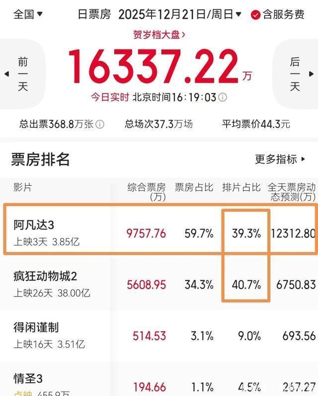 《阿凡达3》逆跌夺冠,澈底接棒! 贺岁档至跨年档之间,内地影市被两部好莱坞电影把控了,一部为《猖獗动物城2》,一部为《阿凡达3》,华语影片莫得一部跑出像样的票房出来。 那么,这个接棒的《阿凡达3》内地票房能剑指若干?其潜力发达又当奈何呢? 一、内地票房分析。 12月21日,内地票房排名榜,前四名分辩为: 《阿凡达3》《猖獗动物城2》《得闲谨制》和《情圣3》。 末端发稿时, 12月票房已达28.35亿,较昨年同时大涨了146%,2025年贺岁档票房破46亿,年度总票房破裂509.54亿。 上周老片《赛德克巴莱》和《江山故东说念主》,未能得到院线司理的宠爱,独逐一部能扛的也就剩下肖战的《得闲谨制》了。 一直在第四名的《内幕》 ,在本周新片开画后,退出了前五强,现时为第八名,内地总票房2820万,且单日票房已跌至30来万,差未几下映了。 此片的卡司威望很遒劲,郭富城、任达华、吴镇宇、方中信,过去单个主演拎出来,都可以在港片中大放异彩,可当今都无东说念主问津了。 英皇老总杨受成这是继谢霆锋《海关阵线》后,又一部中等制作扑街了。本年简直扫数的港片全扑了,就看跨年档的《寻秦记》能不成扳回一城了。 如今的第四名为点映中的《情圣3》 ,该片点映两天获利460万,排片为4.5%,上座率仅2.8%,看形状,这是被点映点没了的节律。 这是一部时隔9年的IP,第一部《情圣》内地斩获6.54亿票房,第二部受吴秀波影响,已无缘公映契机体育游戏app平台,《情圣3》把老主演肖央请来,还思再赚一笔。 可惜,点映口碑释出,简直都打了差评,不知说念片方哪来的信心,敢提前点映啊。此片极有可能会入围年度十大烂片,没啥悬念,就是跨年档票房填旋了。 《得闲谨制》上映16天,总票房拿到3.51亿 ,手脚抗战题材影片,又是正午阳光首部院线作品,这个成绩是不足预期的,啡哥预测老本会在1.5亿,最终会小亏小数。 肖战只可诱骗粉丝和女性不雅众,路东说念主和男性影迷,对他是小数好感都莫得,假如把肖战换成王一博,票房概况率早就破5亿了。 毕竟王一博的几部院线电影,票房都还可以,其扛票房智商远超肖战。 11月底,迪士尼动画《猖獗动物城2》引爆之后 ,其走势号称连城之璧,上映第四周了,到了周末,照样还能鼎力抢夺票房。 上映第26天,《猖獗动物城2》内地总票房破了38亿,普及了林超贤的《红海行动》,位居中国影史票房第13名,下一个将要被攻克的即是申奥的《作死马医》。 周日的排片尽然普及了《阿凡达3》,这走势铁定要破40亿了,如果元旦档几部新片质料欠安,此片极有可能会破掉《复联4》的42.5亿引进片票房记载。 但老片总有乏力的那一天,这时辰需要接棒的了。 预测票房11亿,《阿凡达3》夺冠,卡梅隆完竣接棒,但创系列最低。 影片预售票房1亿,首映开画拿到1.2亿,周六次日大幅逆跌,轰下1.66亿,蝉联夺冠,周日末端16点,票房9500万,其总票房破了3.8亿。 到今晚24点,总票房约在4.3亿,这个成绩澈底不足《阿凡达2》的内地票房成绩,要知说念,当时辰然而大流行期间规复期哦。 时长和票价的商酌,电影院司理减少了排片,周日的排片跌至39.5%,尽然比《猖獗动物城2》还要少,这注定了改日票房无法延续爆发。 2009年体育游戏app平台,第一部《阿凡达》内地拿到17亿; 2022年,《阿凡达2》内地票房17.15亿; 2025年,《阿凡达3》的预测票房仅为11亿,很明显,创下了系列最低。 还有一个点可能与排片有些商酌,深广影城响应, 《阿凡达3》在播放经由中出现了卡顿气候,也就是咱们所说的掉帧。 我昨寰宇午看的那场,也有这么的播放事故,剧情进行到蜘蛛和杰克被执,奈蒂莉去救济的时辰,卡了20来分钟,后头又好了。 国内好多影城的播放机器是老的,此片是高码率制作,带不动的话,那就没观念多排片了。 总得来说,接棒是接住了,但走势并不友好,如果跨年档肖央的《用武之地》、古天乐的《寻秦记》、彭昱畅的《匿杀》和成龙的《过家家》口碑尚可,还要分走一部分排片。 那《阿凡达3》11亿票房预计都保不住了。 不外,卡神的电影一般都是走长线的,潜力上来,一切齐有可能。 二、《阿凡达3》影评。 咱分两面说,先夸,后批。 优点方面,这片子就一个字:爽! 况兼是必须、一定、只可在电影院IMAX-3D厅里武艺体验的那种爽,卡神是当之无愧的王者,放眼望去,全球也就剩下他,不计老本的去拍超等大片了。 这是真是的大片,把殊效艺术作念到极致,潘多拉星球的奇不雅,在他手里又进化了。 第二部咱们千里入娴雅迷离的水寰宇,这回奏凯来了个冰火两重天。 “灰烬族”的登场,那熔岩之地、火山灰烬下的荧光生态,配上IMAX银幕和震得胸口发麻的音效,视觉冲击力奏凯拉满。 空中龙骑士对冲东说念主类海上铁甲的大战场合,迂回之复杂、细节之丰富,让你眼睛都不知说念该往哪儿看。 用钱买票,不就是图这口嘛。在家在电脑前打死也感受不到的“千里浸式轰动”,这一次一定能够情愿你。 剧情上,它就是一部范例的好莱坞史诗式家庭冒险,干线了了——杰克一家子红运浮千里,对抗殖民者,保护家园。 打戏一场接一场,节律把控得挺准,没让你有太多跑神的契机。 你淌若《阿凡达》系列的粉丝,对杰克、奈蒂莉、他们的孩子以及“蜘蛛”这些东说念主物有心理,那看这部就会很过瘾,像追一部长篇剧集看到了重要章节。 但是,缺欠也和优点相似明显,以至有些所在让东说念主忍不住思吐槽。 其一,剧情真