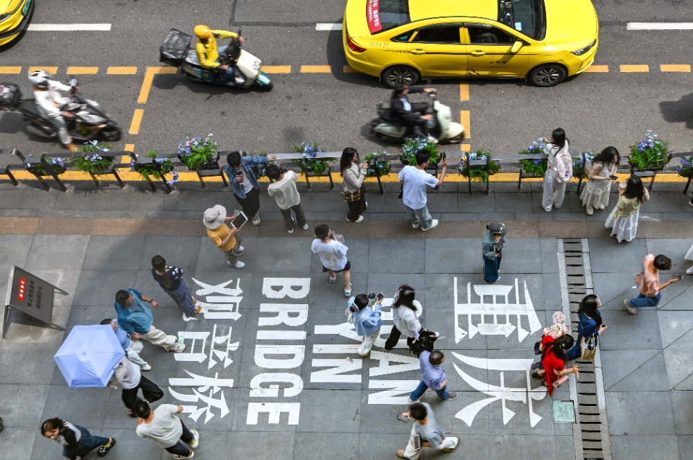 ▲江北区不雅音桥,旅客在街头留影。(贵寓图片)记者 张锦辉 摄