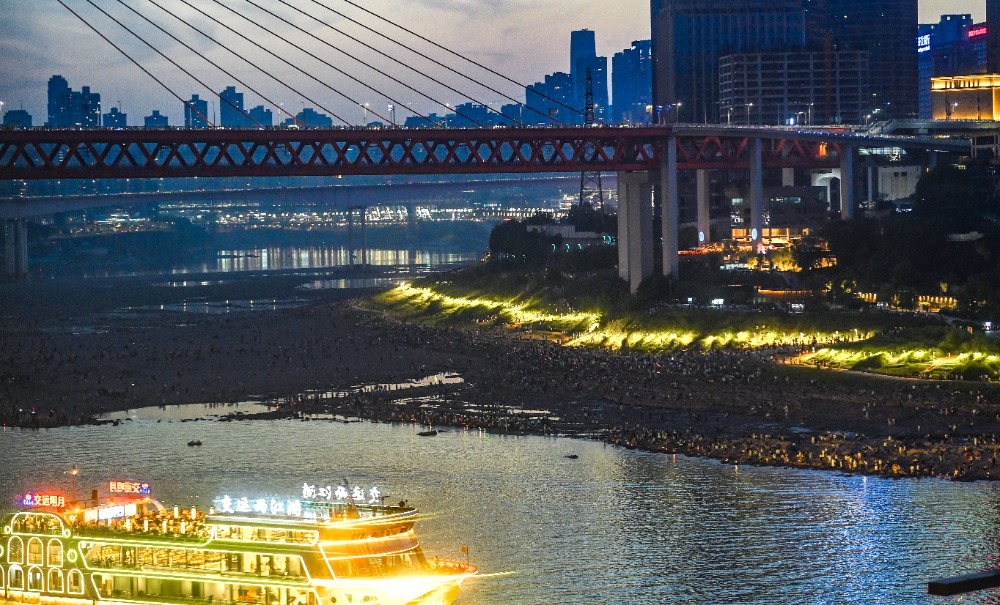 ▲江北嘴江边,宽绰旅客正在江滩上观赏重庆好意思景。(贵寓图片)记者 郑宇 摄