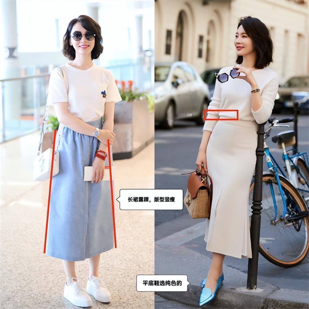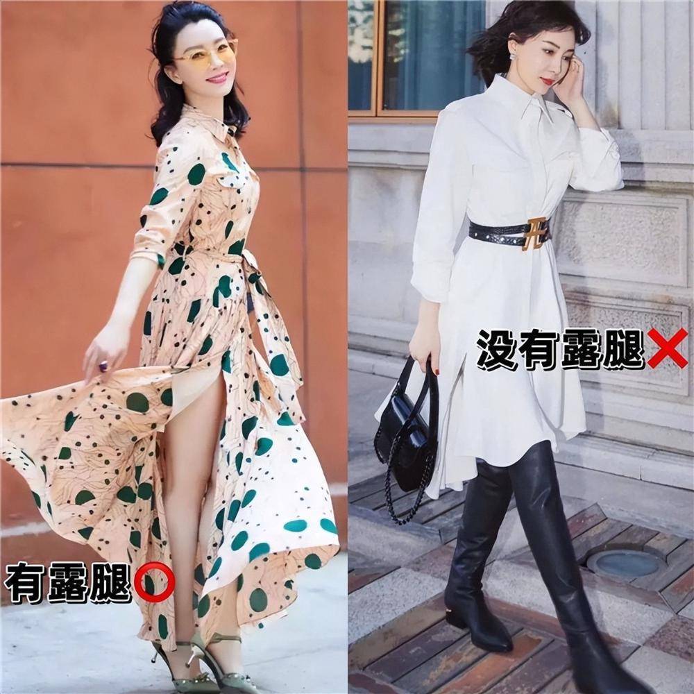 穿长裙亦然很有谨慎的,举例下半部分不成太保守,莫得露腿的穿搭,只会谩天大谎,视觉上更显腿短,是以不保举配高筒靴和高筒袜,换成浅口鞋,裙摆袭取高开叉操办,显瘦显高又讲求。
