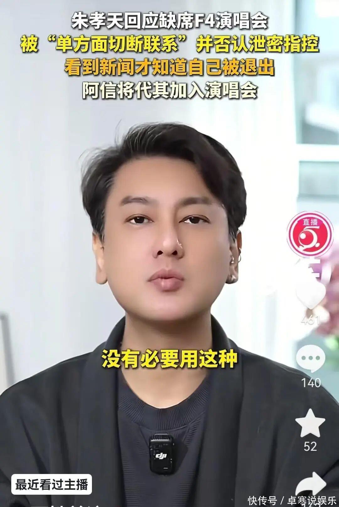 朱孝天一直被质疑情商太低,他屡次吐槽F4歌曲“从邡”、称与成员“九年不运筹帷幄”,这次发言再被批“又卑又亢”。
