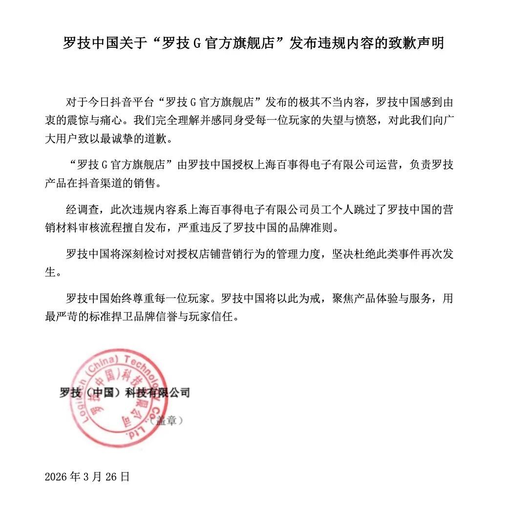 公论炸锅后,罗技中国当晚伏击发声明致歉,把锅甩给了授权代运营公司上海百事得,说是底下职工“跳过审核经过私自觉布”,还说已下架视频、严肃处理沟通东谈主员。代运营方上海百事得也同步致歉,称“毫不推诿拖累,承担店铺科罚、监督与价值不雅传导的一齐拖累”,并暗示“团队已被严肃处理,罗技品牌方已径直介入监督账号运营”。