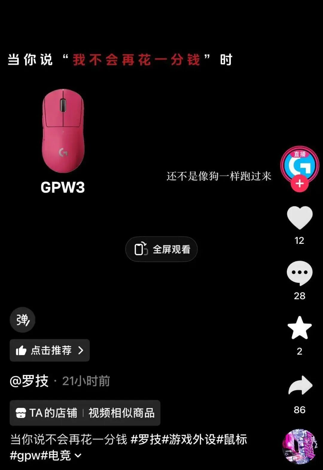 也不知谈是搭错了哪根筋,抖音罗技G官方旗舰店发了条GPW3鼠标实行视频,案牍和旁白径直来一句——“当我一降价,你还不是像狗相似跑过来”。
