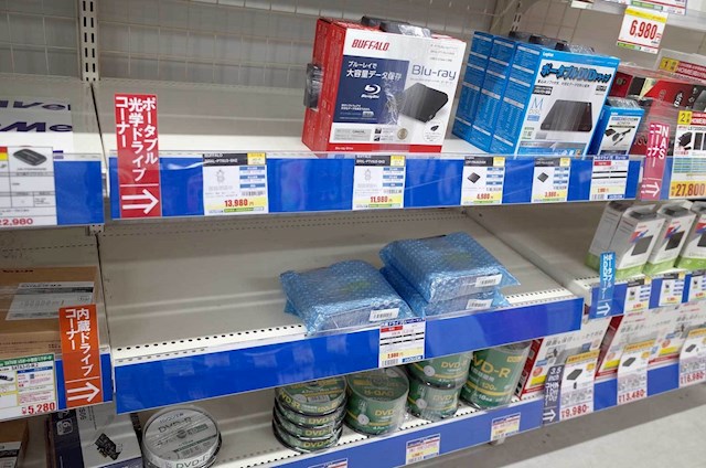 在秋叶原,险些系数渠谈的光驱齐也曾卖光了,尤其是性能更好的BD-R蓝光光驱,天然鄙俗的DVD-R光驱也货源稀缺。