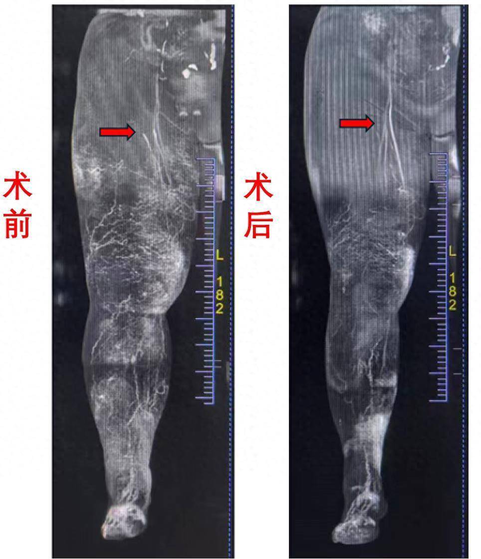 1个月后复查,罗大姨的右下肢肿胀又好转不少,小腿和足部改善尤其彰着。淋巴管磁共振造影也暴露,吻合的淋巴管和静脉 “通得很顺”,淋巴液回流十足泛泛。